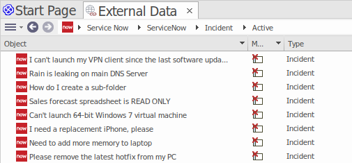 (If you cannot see ServiceNow or a list of ServiceNow tables, check through the procedures in this topic, or the broader and more detailed topics in the Integration Plug-ins section to see if there is a step you have missed or a prerequisite that is not satisfied. You can also check the Troubleshooting Help topic.)
