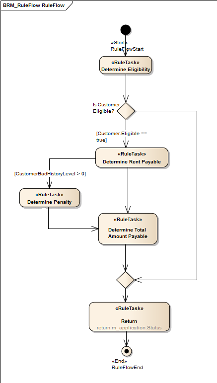 | • | For code generation, the Rule Task elements must be grouped inside the appropriate Rule Flow Activity in the Project Browser; however, Rule elements can be defined anywhere in the model, as they can be used in more than one Rule Task |