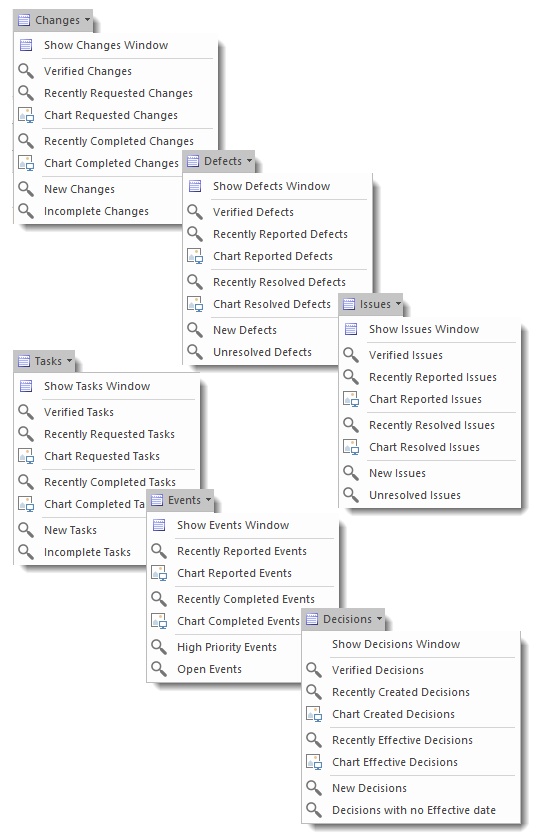 You will find everything you need to manage change elements inside Enterprise Architect. Show the Changes windows, quickly see verified changes, new changes and incomplete changes. Searches and charts for recently requested changes and recently completed changes also available.