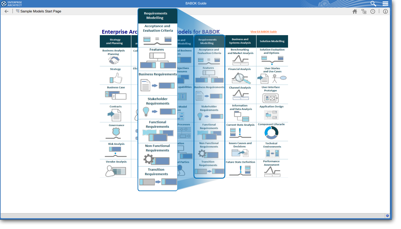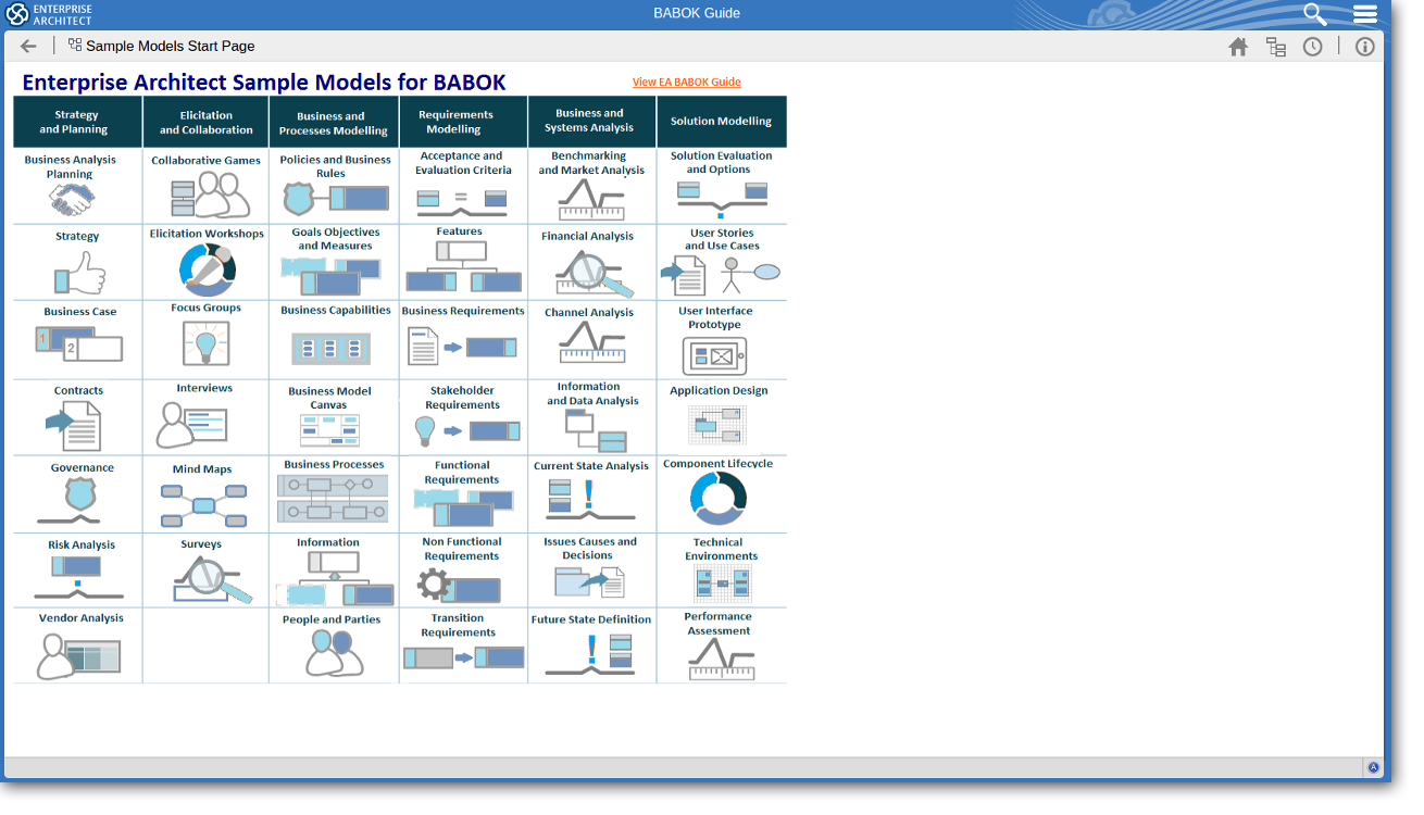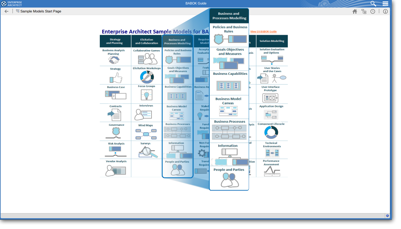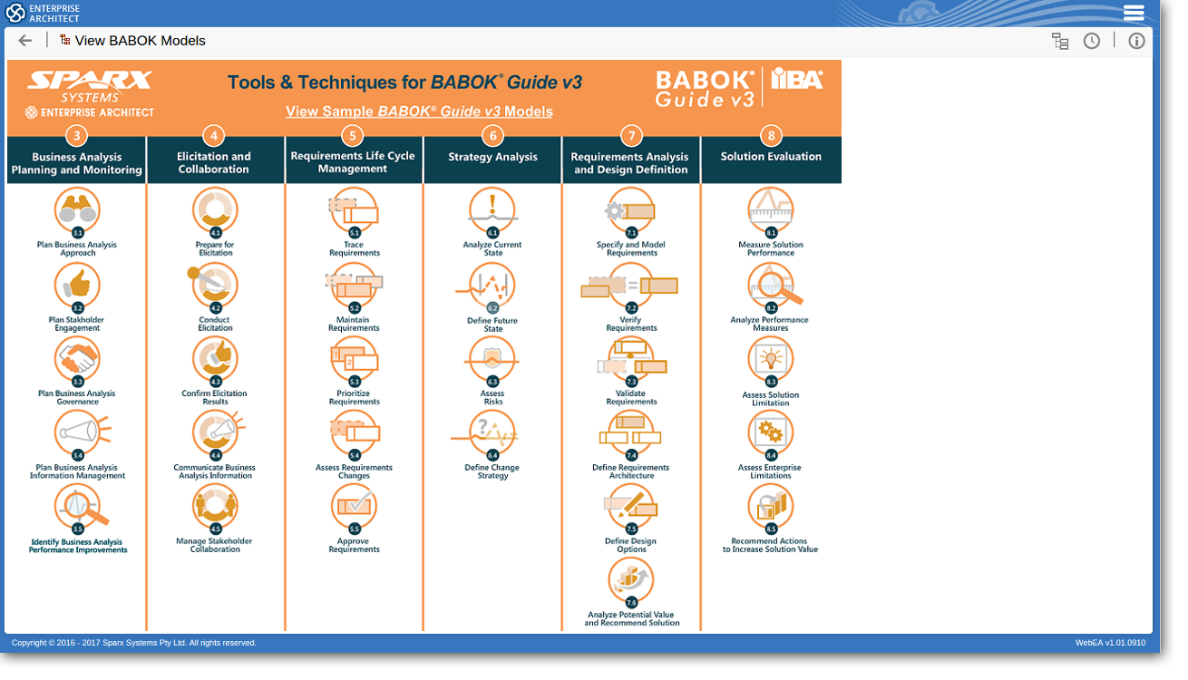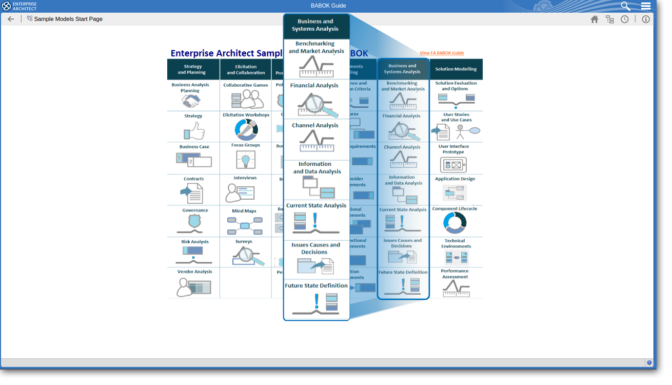 Specific to Business Analysis Knowledge Area topics within the BABOK Guide v3, corresponding Enterprise Architect sample models facilitate unparalleled productivity for Business Analysts.