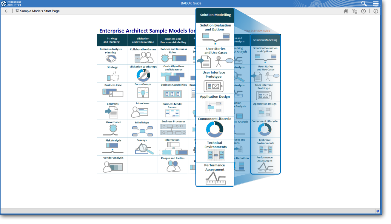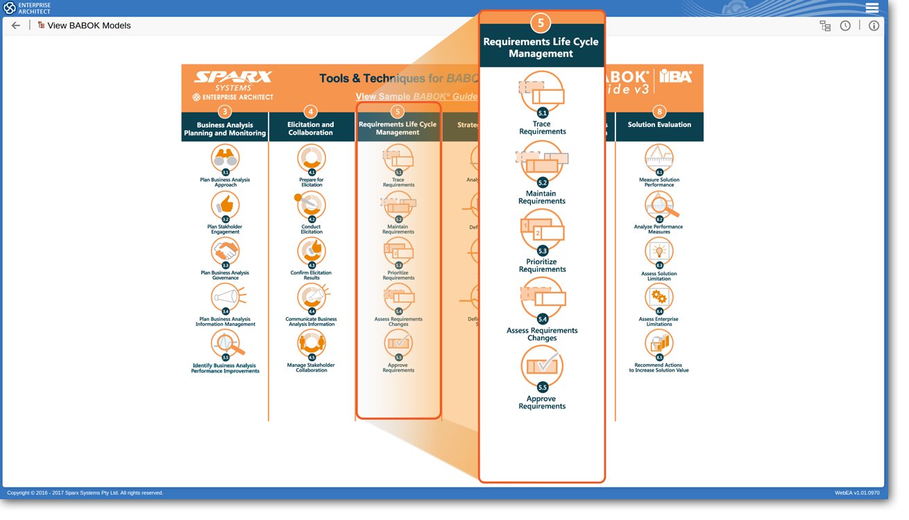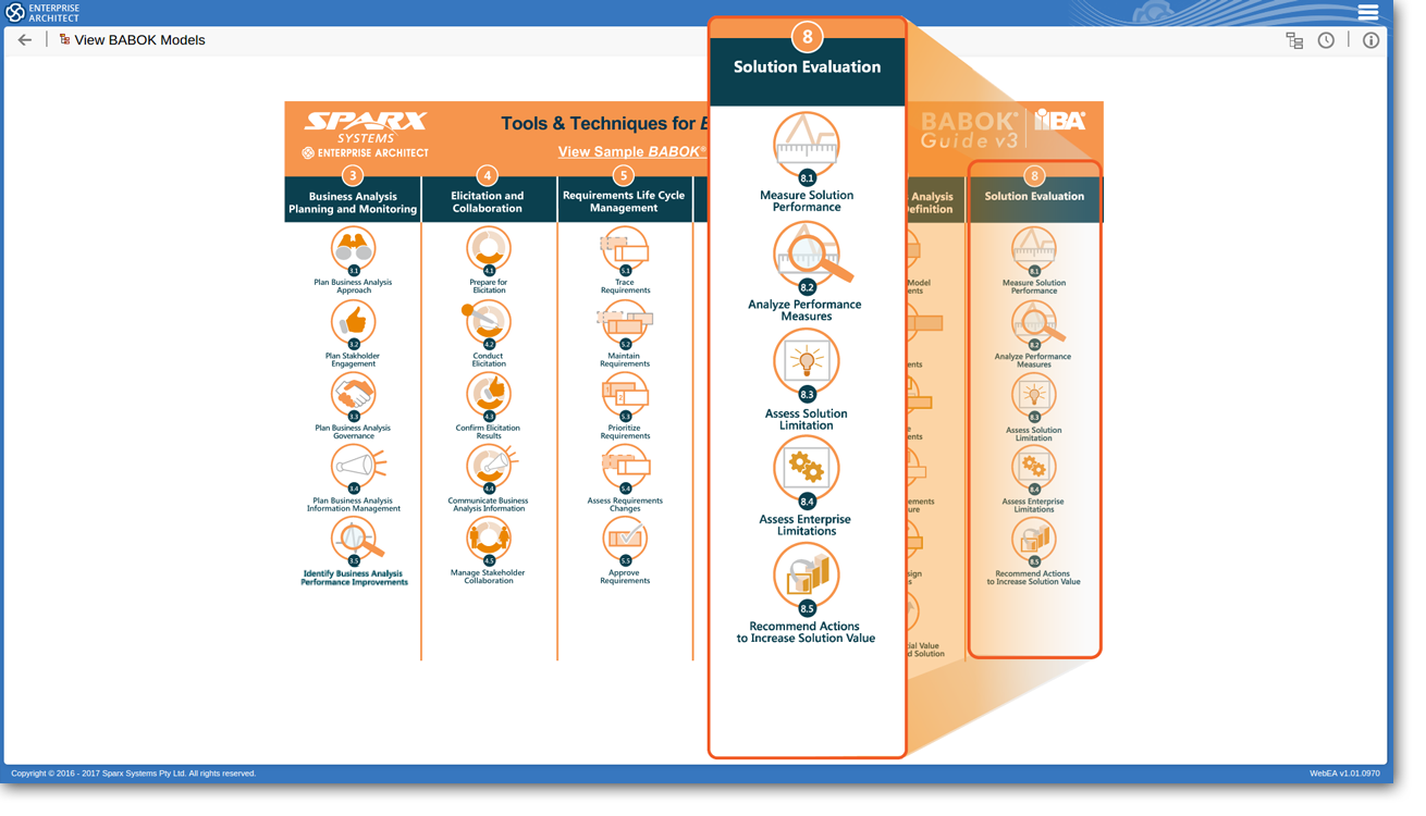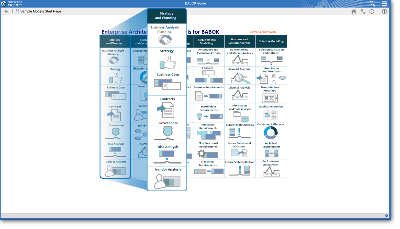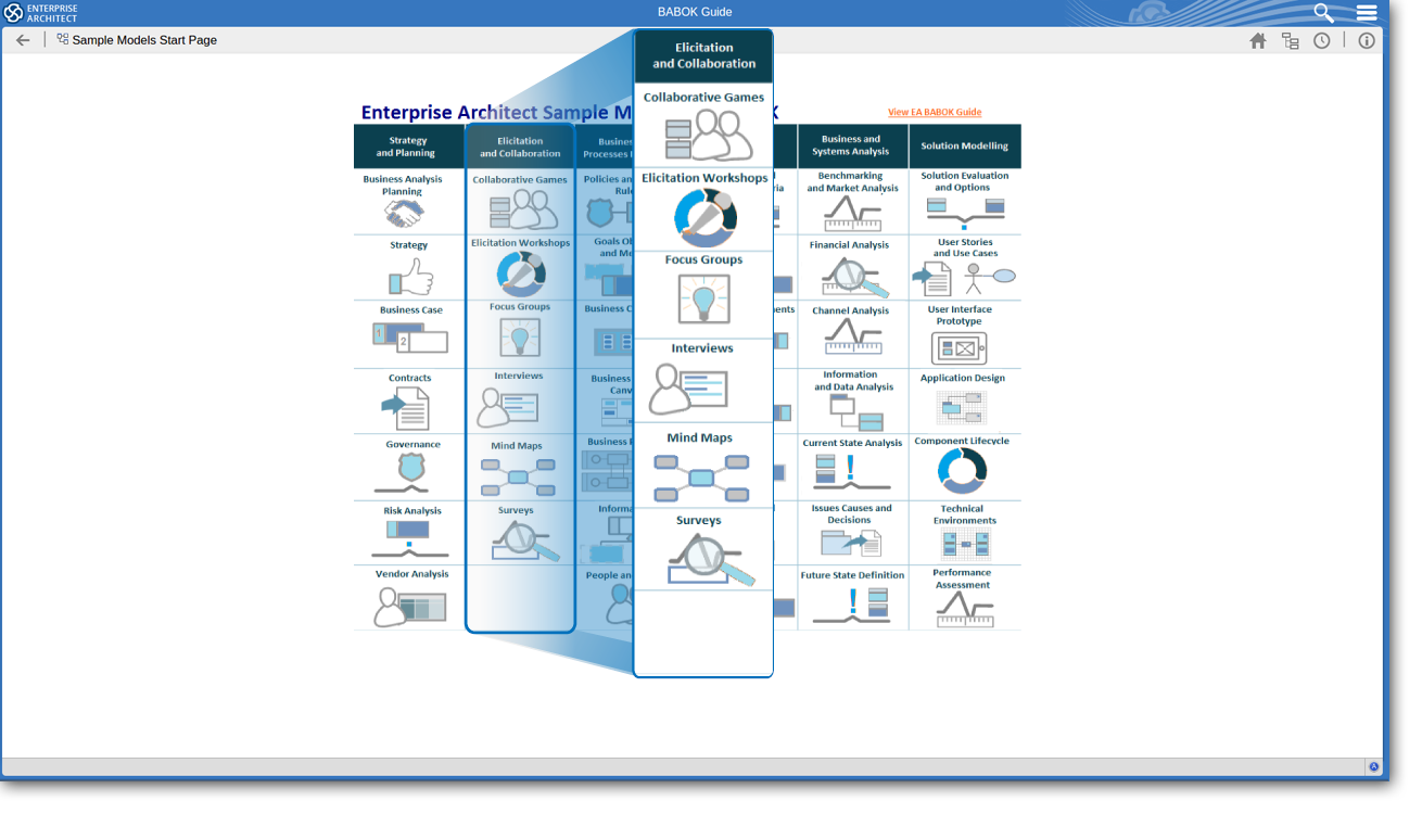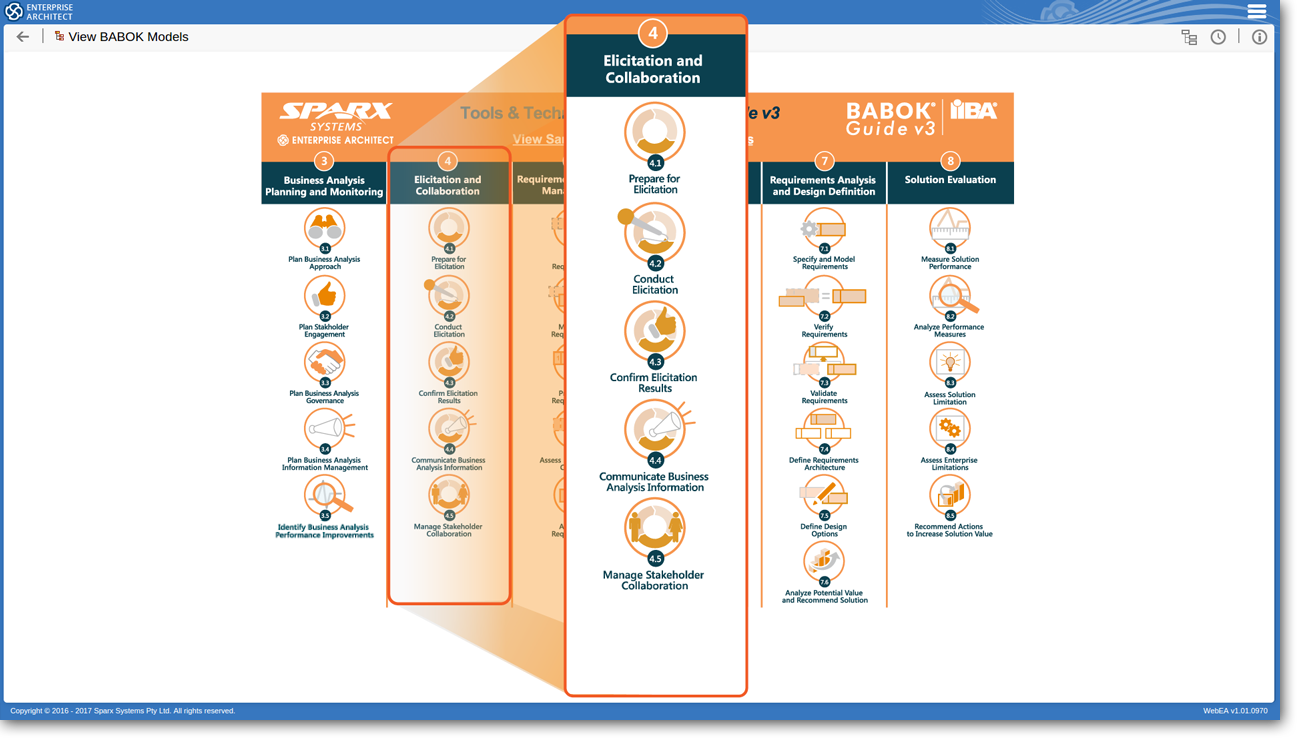 Specific to Business Analysis Knowledge Area topics within the BABOK Guide v3, corresponding Enterprise Architect sample models facilitate unparalleled productivity for Business Analysts.