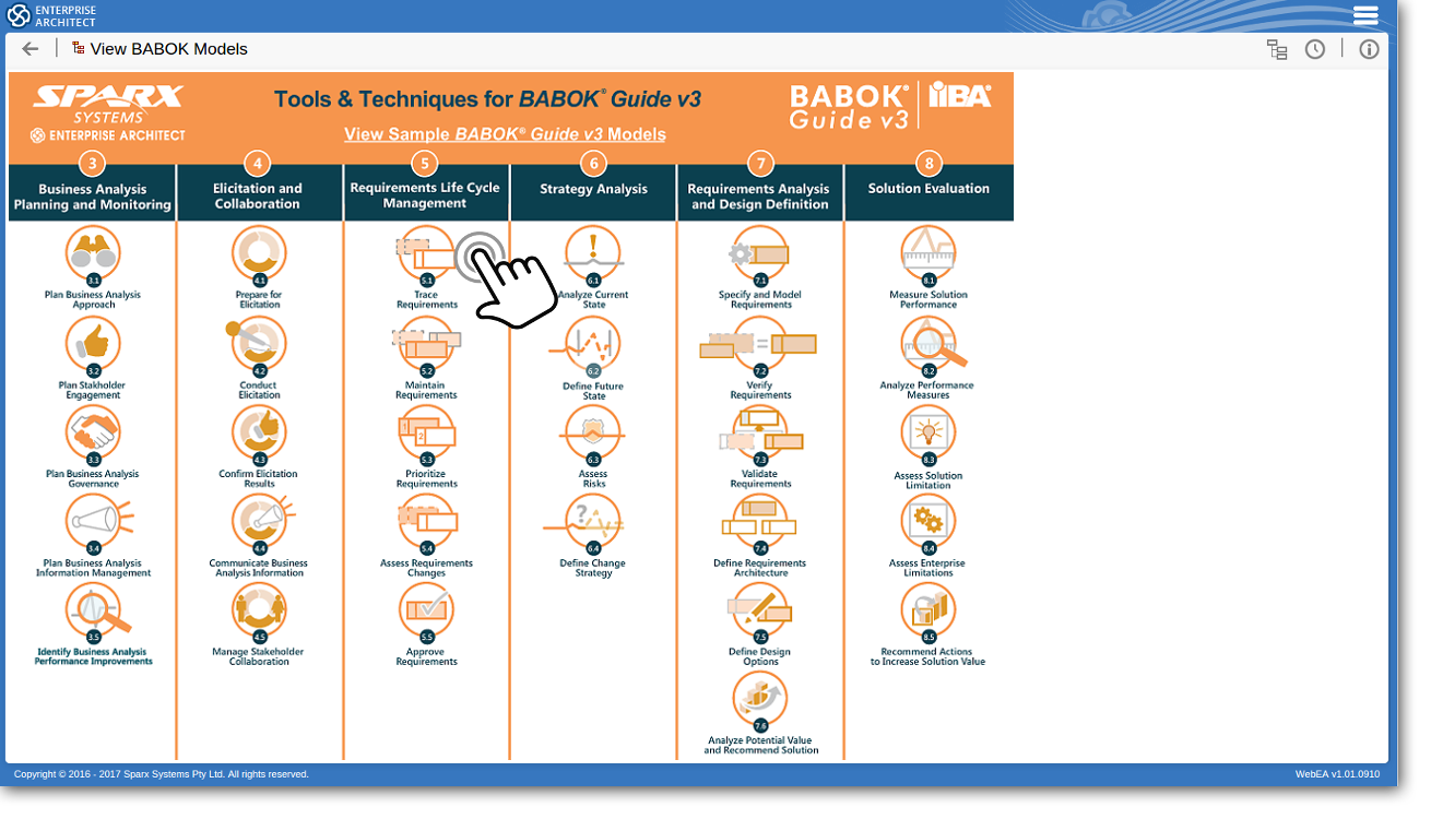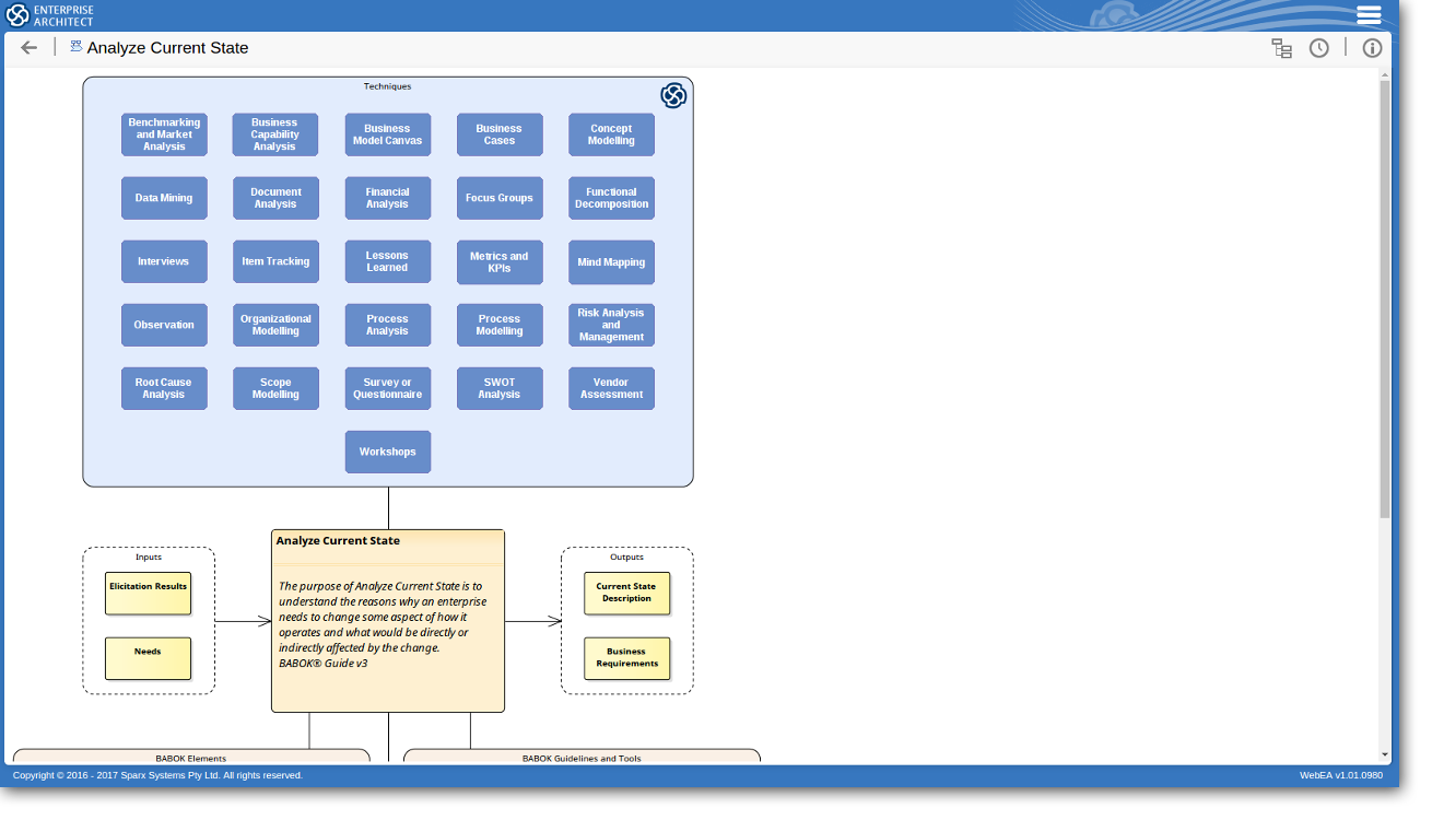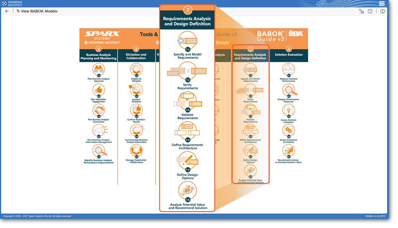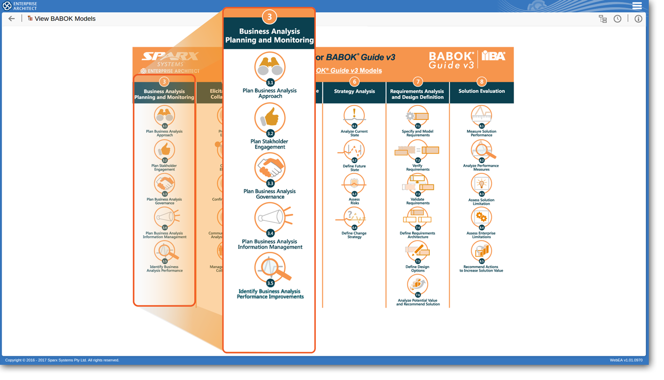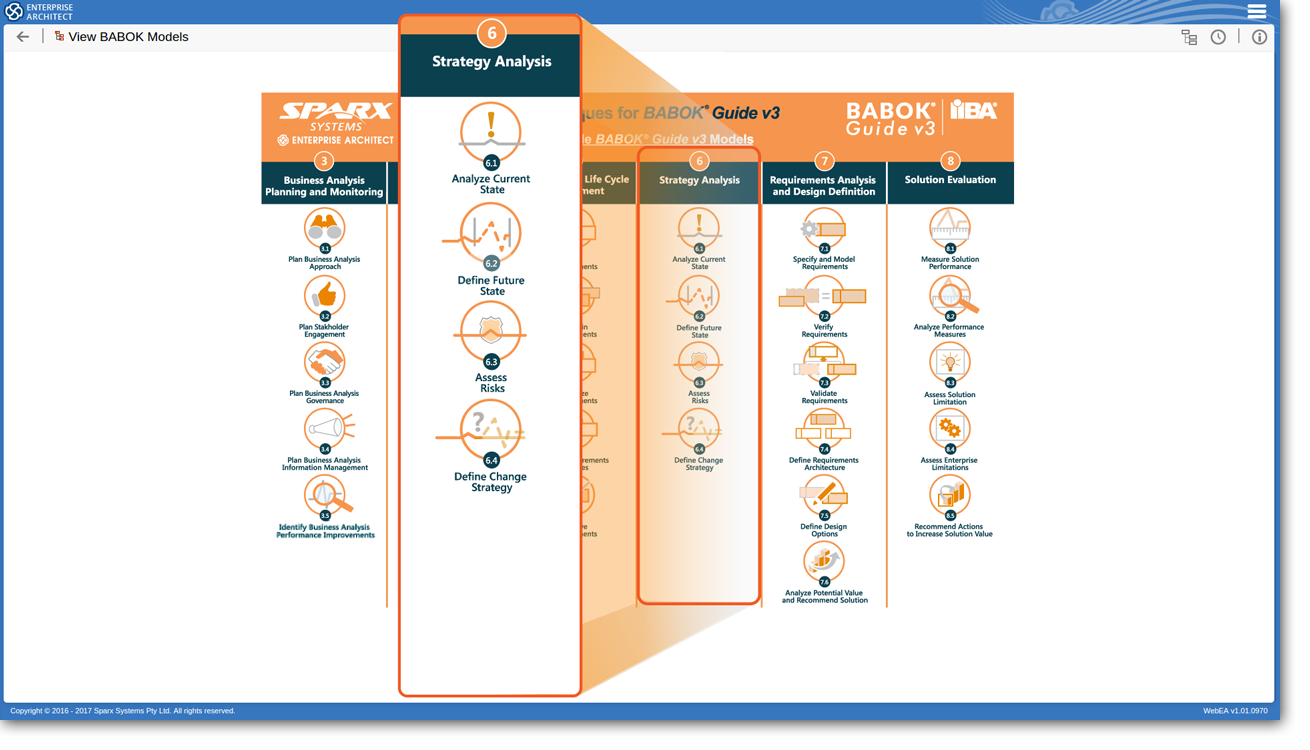 Specific to Business Analysis Knowledge Area topics within the BABOK Guide v3, corresponding Enterprise Architect sample models facilitate unparalleled productivity for Business Analysts.