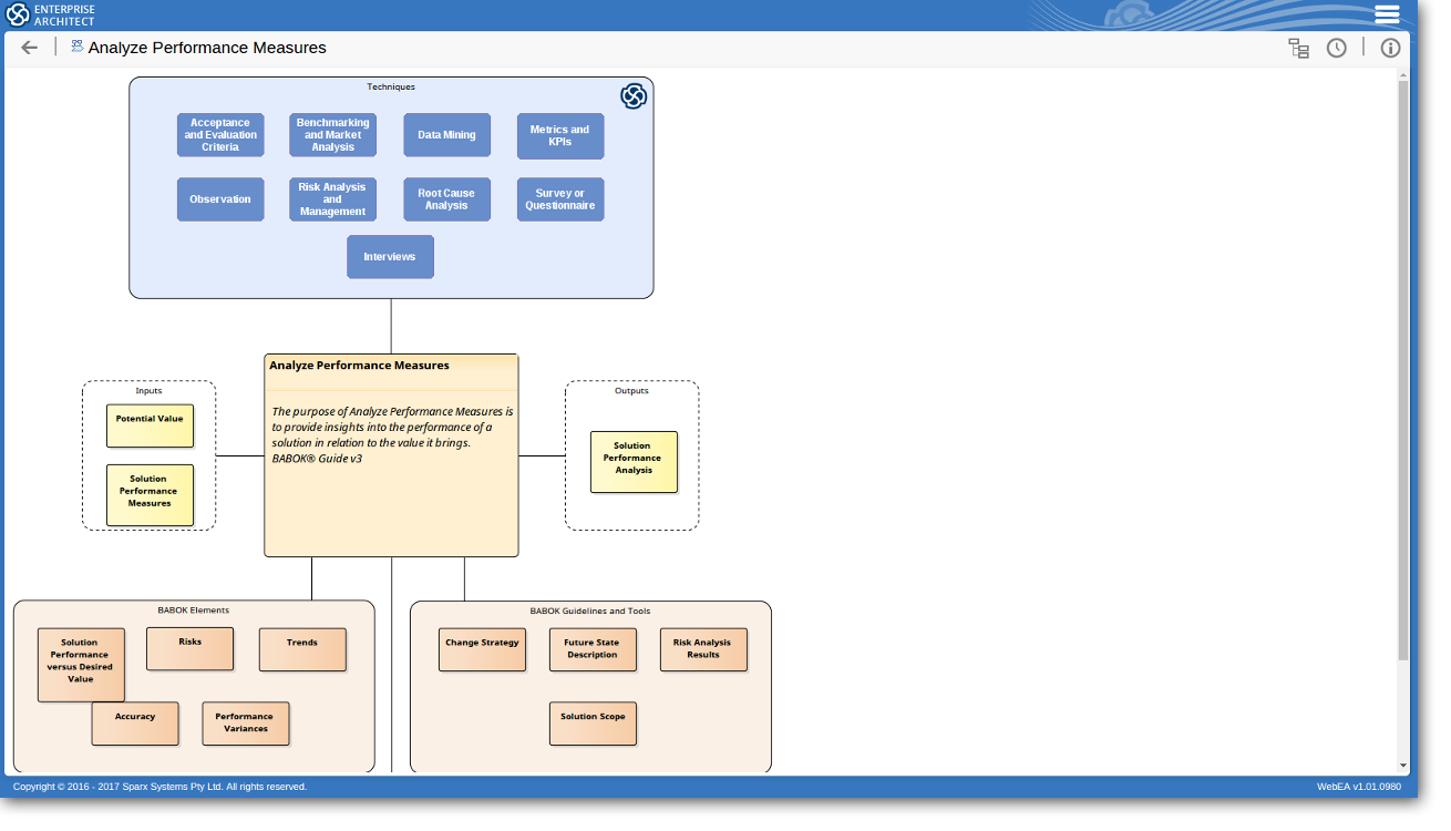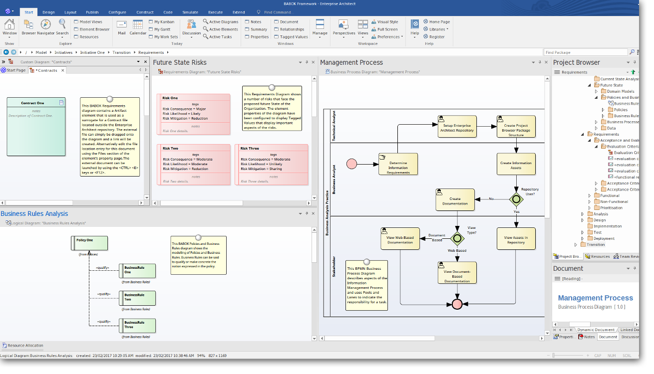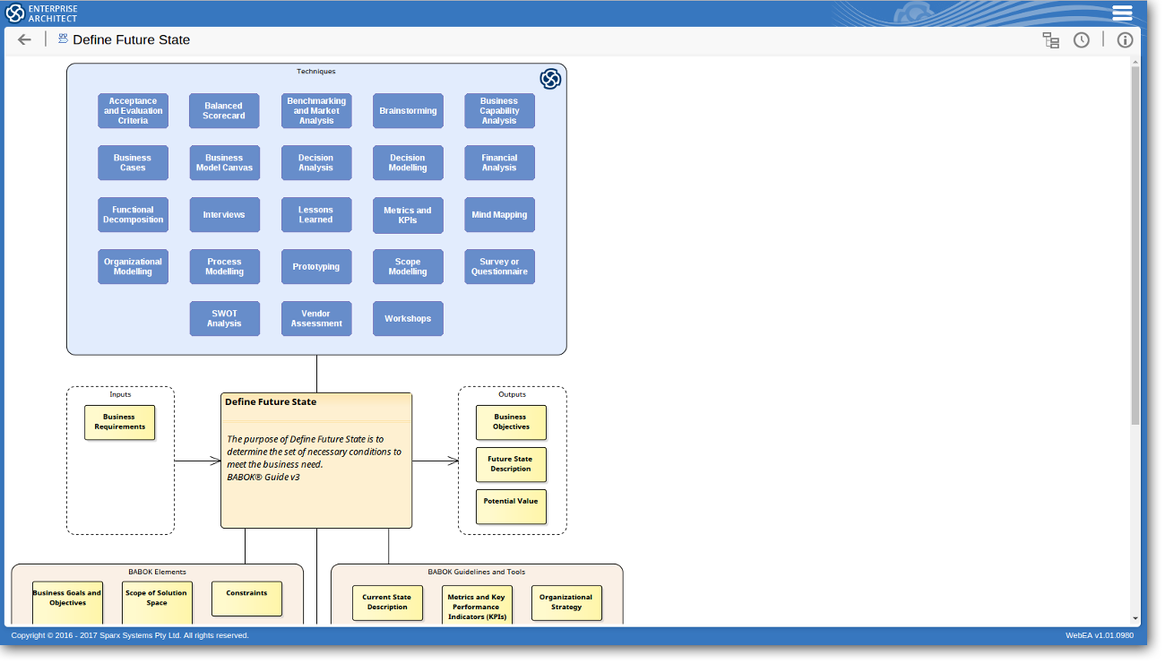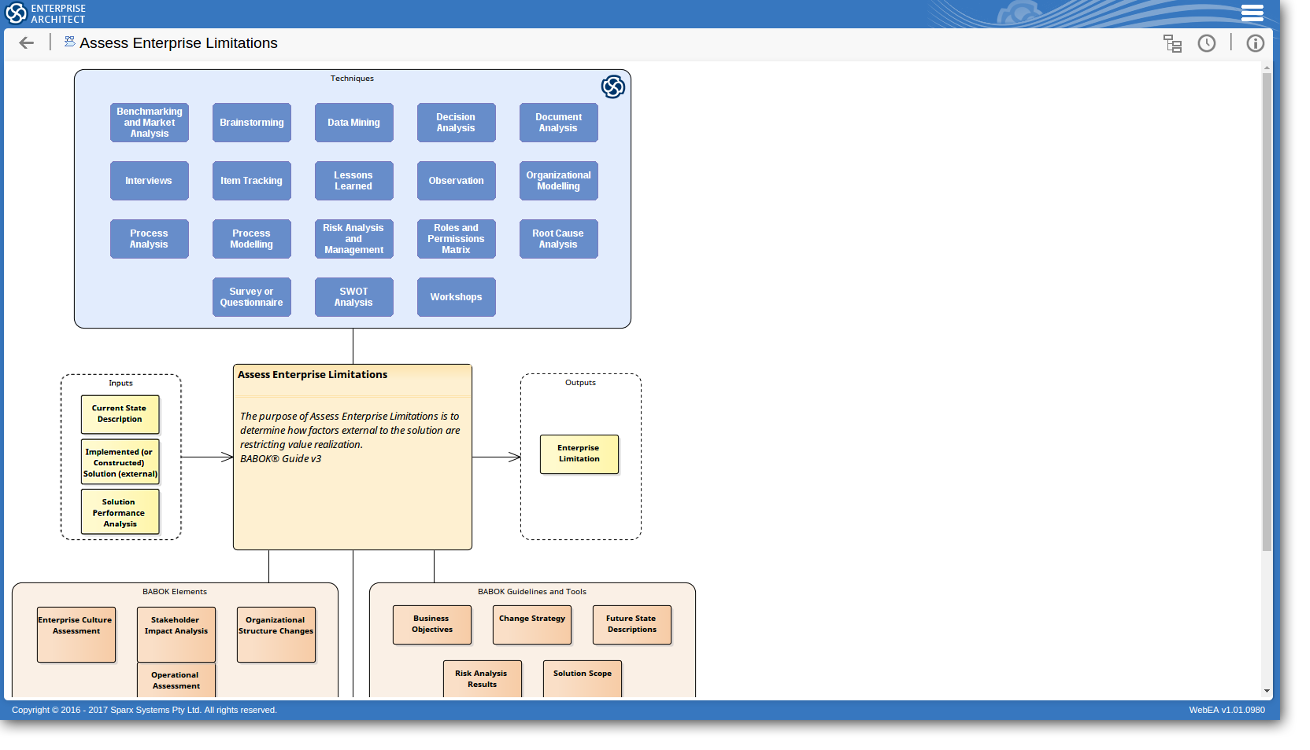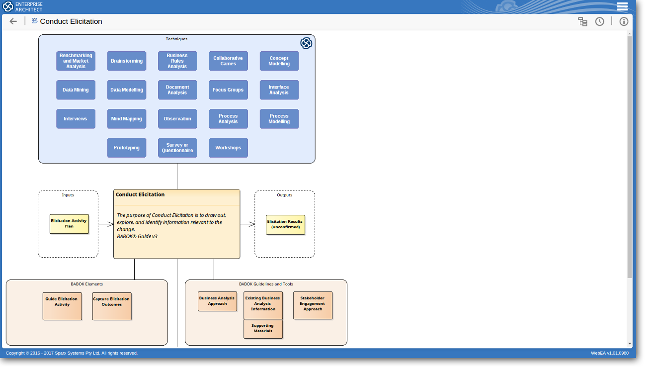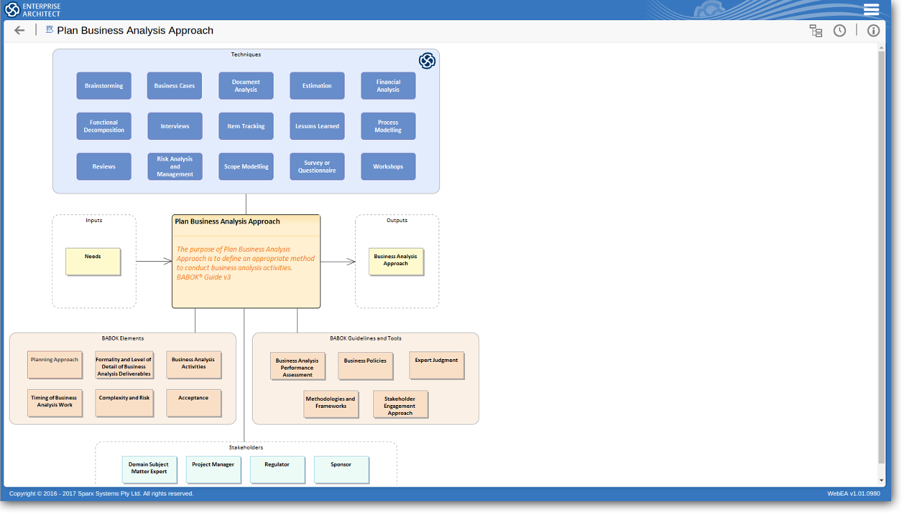 Specific to Business Analysis Knowledge Area topics within the BABOK Guide v3, corresponding Enterprise Architect sample models facilitate unparalleled productivity for Business Analysts.