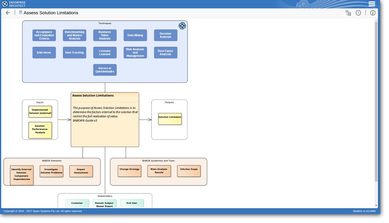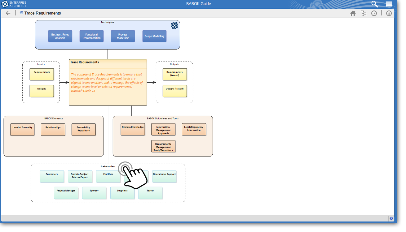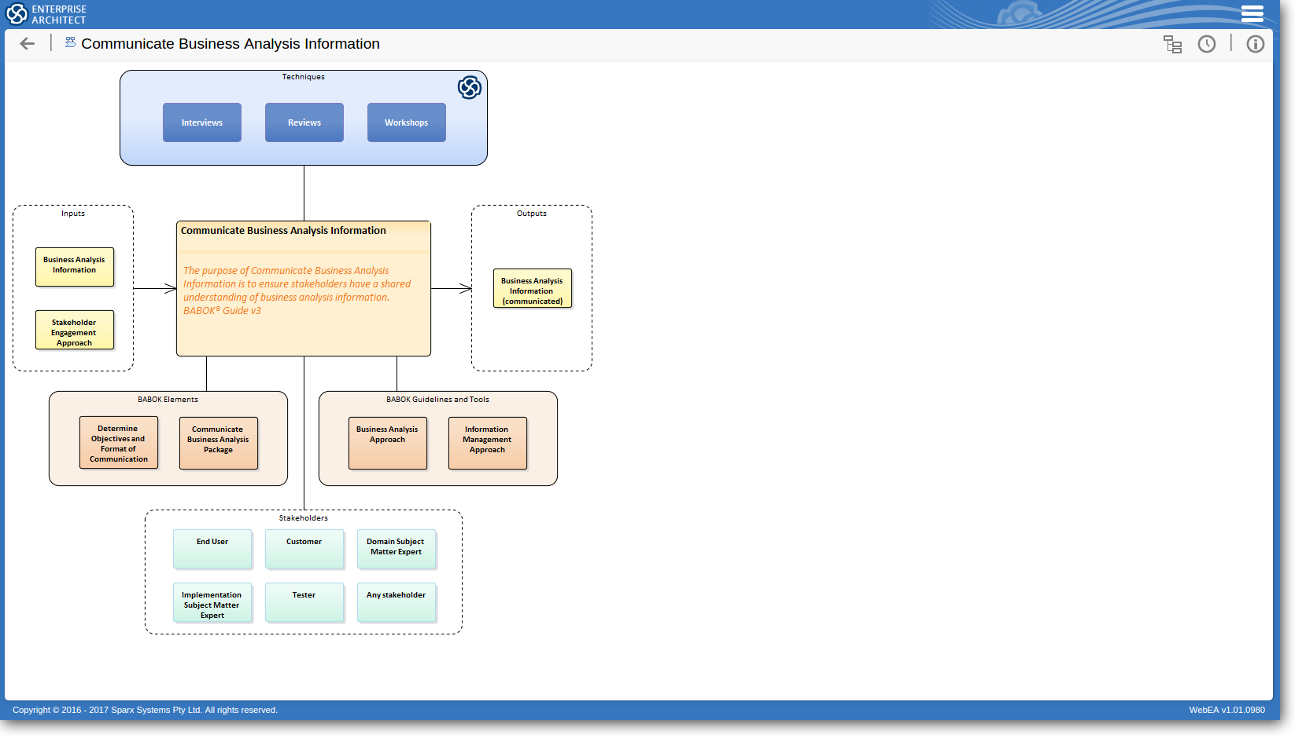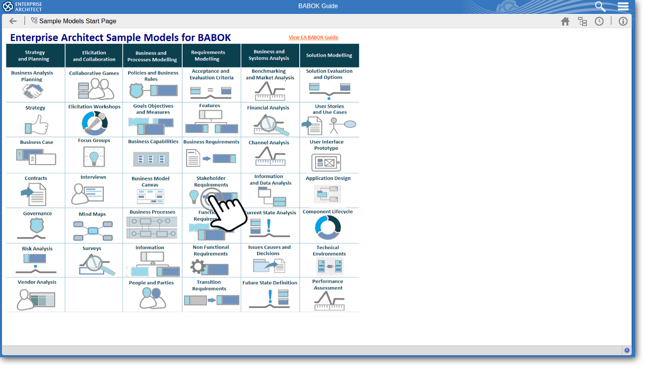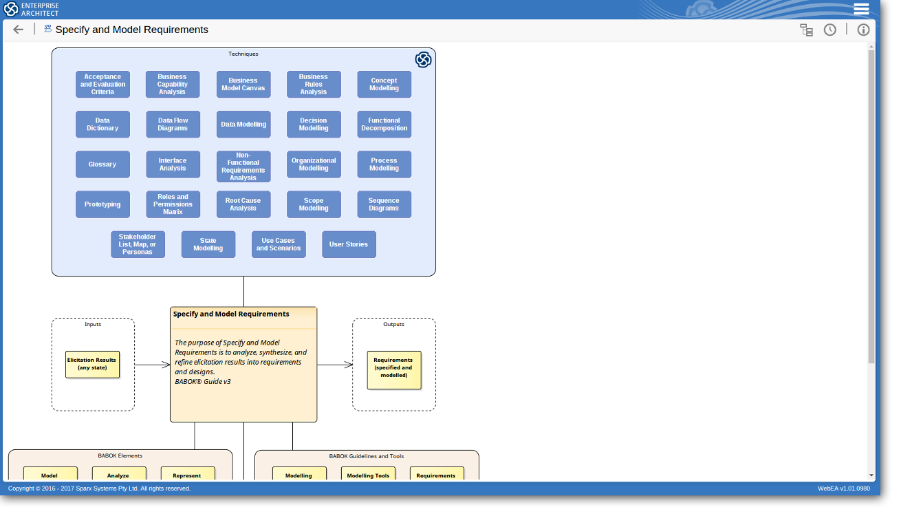 Access sample models that show you how BABOK Guide v3 concepts can be referenced using Enterprise Architect.