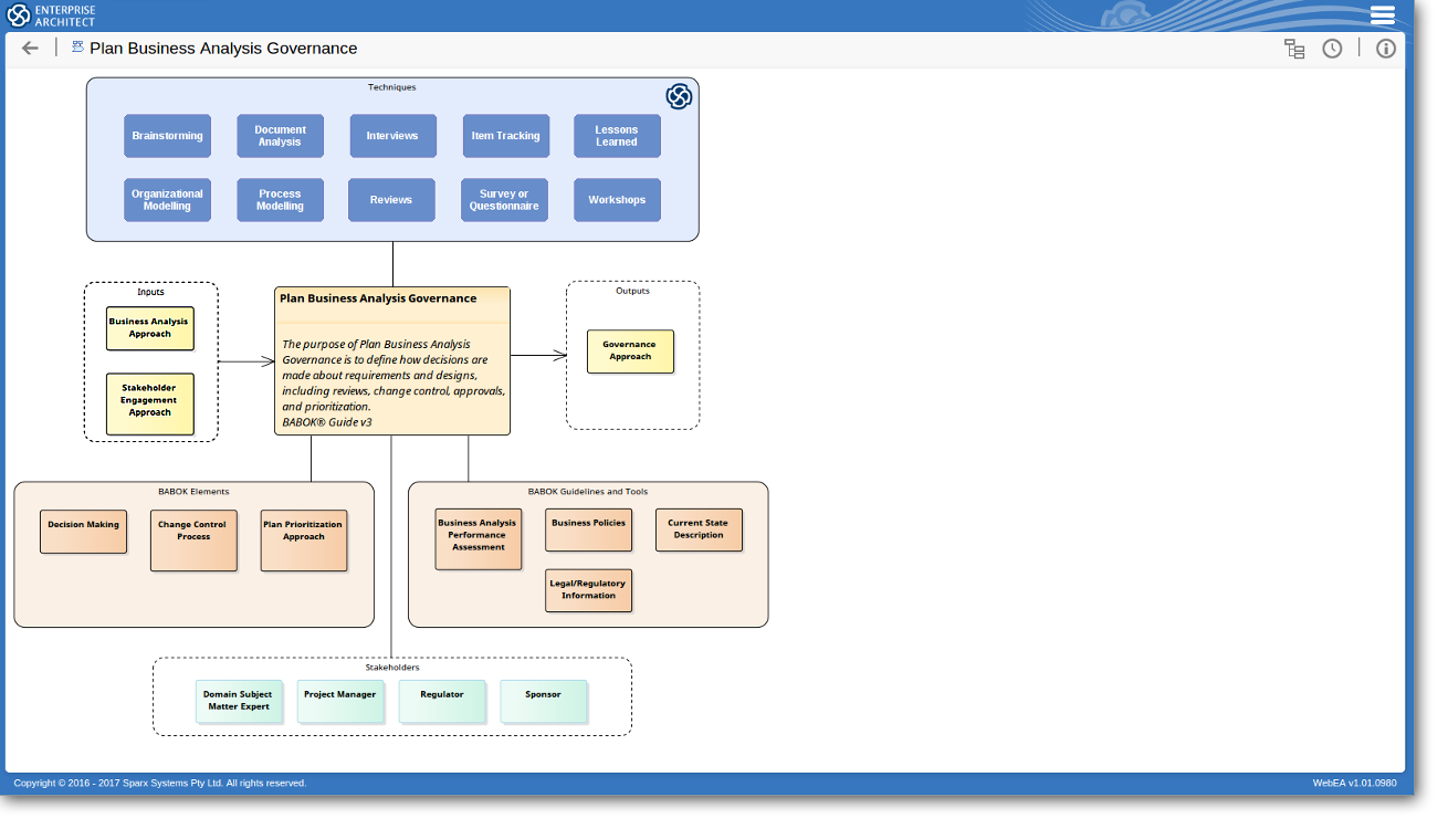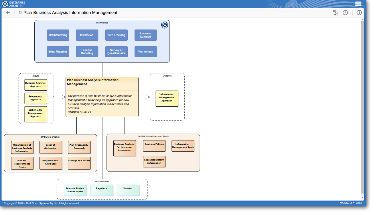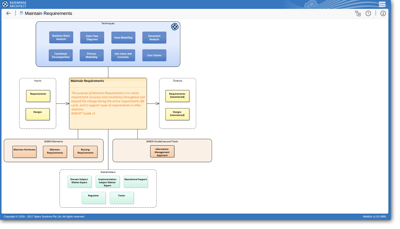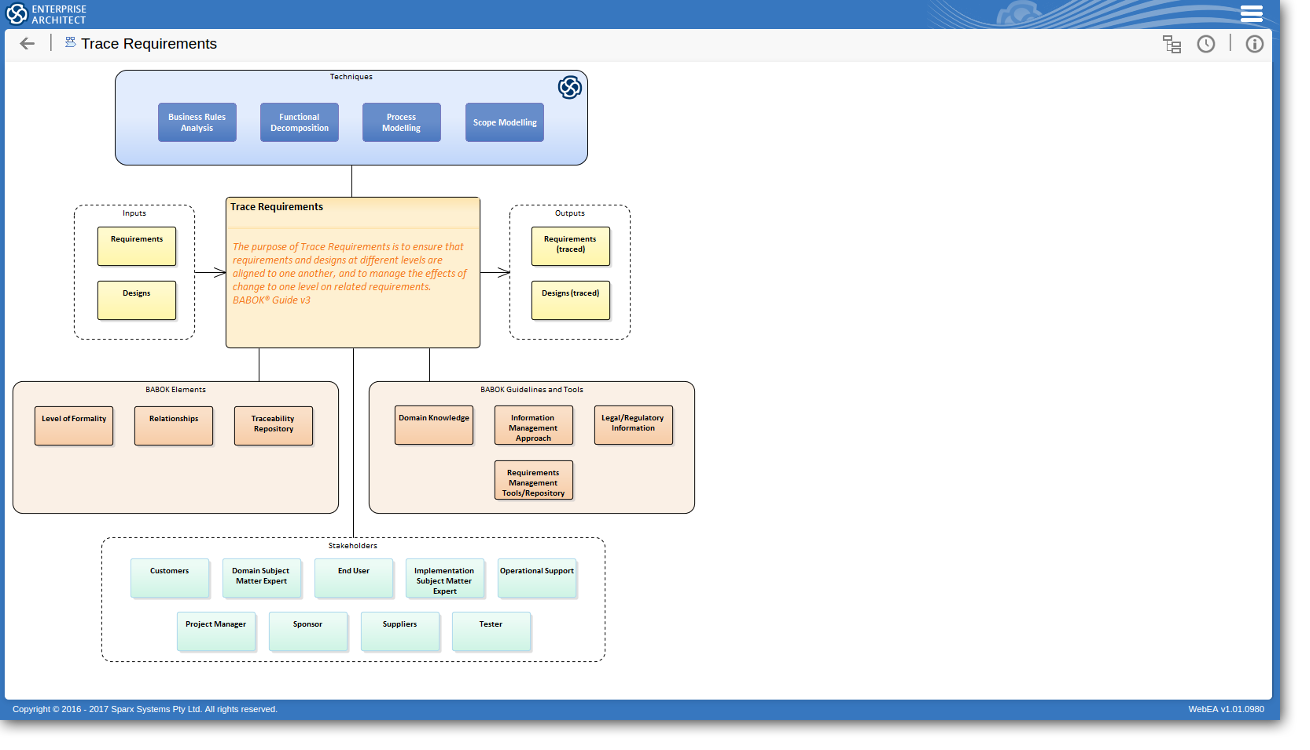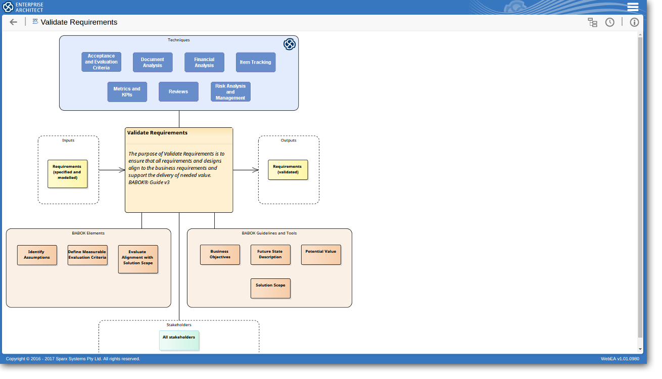 Access sample models that show you how BABOK Guide v3 concepts can be referenced using Enterprise Architect.