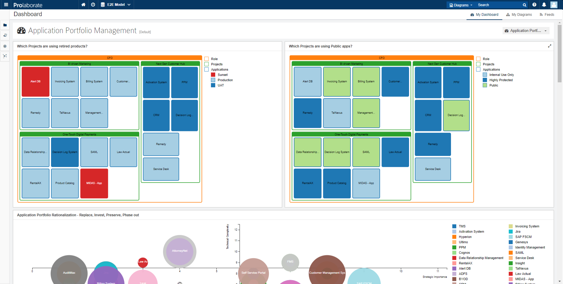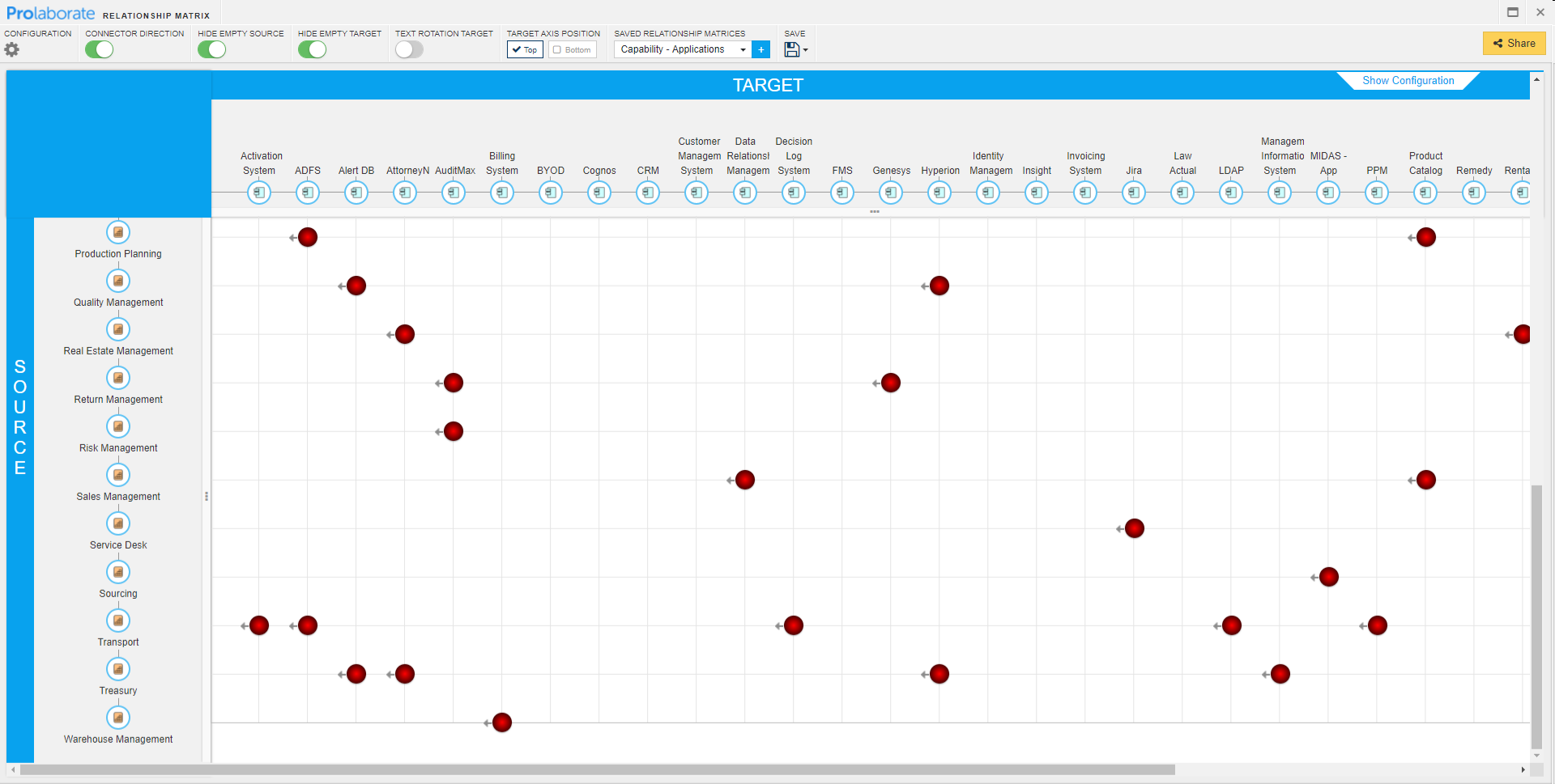 Highlight the impact of business changes by visualizing and analyzing relationships. In the screenshot, we see the applications that rely on business capabilities.