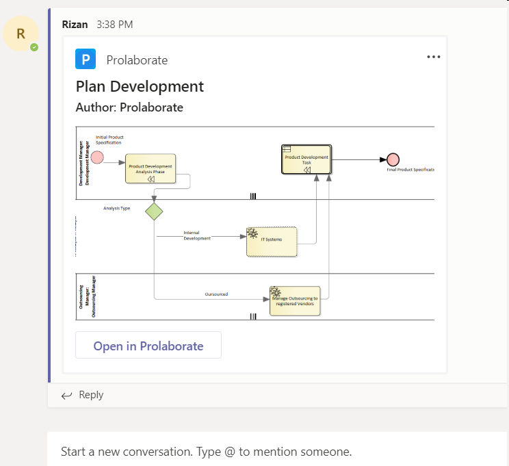 Easily share live architecture and modeling information from your Enterprise Architect (EA) models to Microsoft Teams. In the screenshot, we see a business process has been shared with the audience to get feedback.