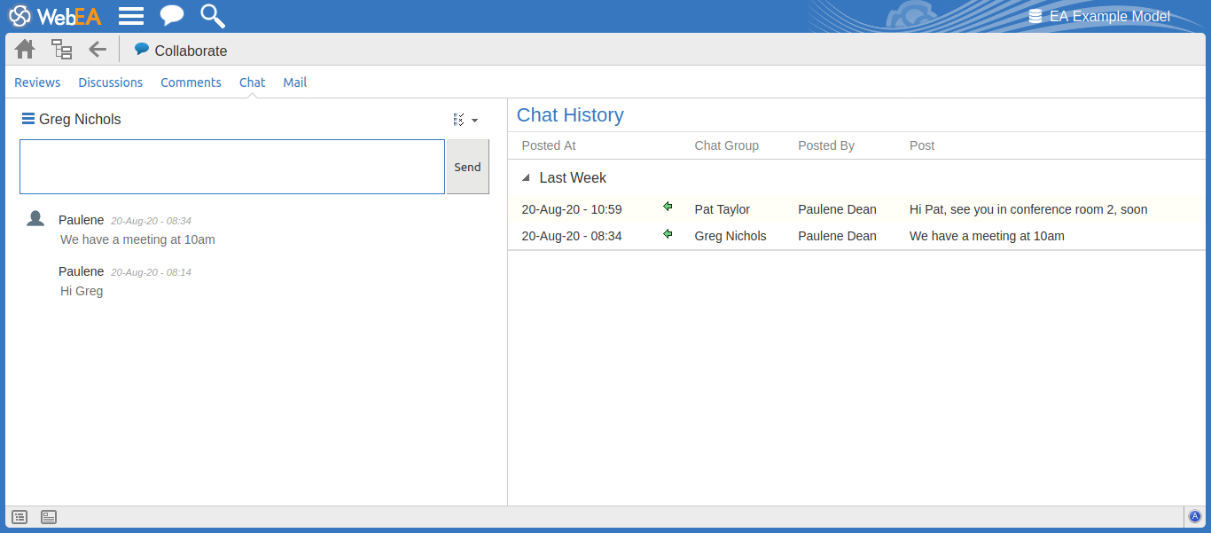 • The Chat tab allows you to participate in live Chat with users or groups within your model; this tab also includes a history of recent Chats that you are participating in - if a new Chat is received while not in the Collaboration View, a notification will appear in WebEA's status bar
