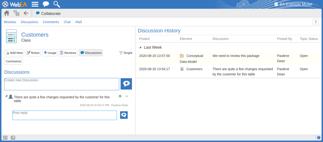 • The Discussions tab lists recent discussions within your model; selecting a discussion will allow you to see the element's properties and post a reply, directly from within the collaboration view