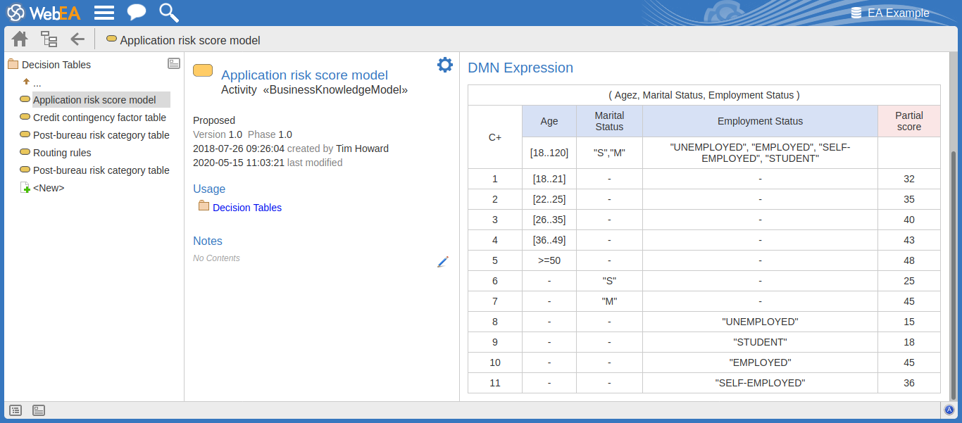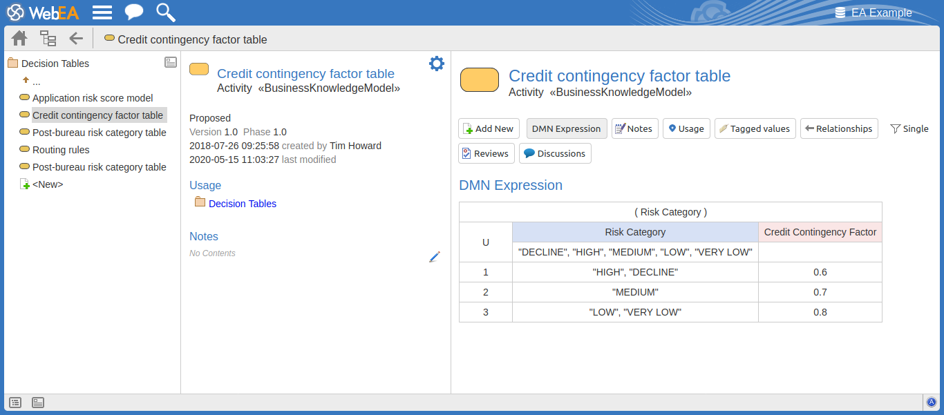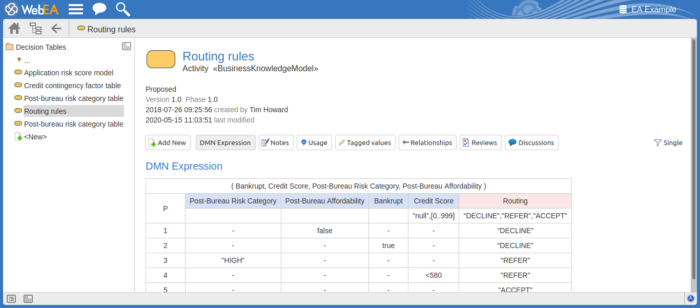 WebEA's main element properties now supports display of DMN Decisions tables. This includes tables using 'Rule as a Row', 'Rule as a Column', or the new 'Rule as Crosstab' layout introduced in EA 15.2.