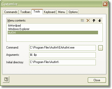 To define an application runable from EA - select from the main menu the Tools | Customize | Tools tab option. With this you can: