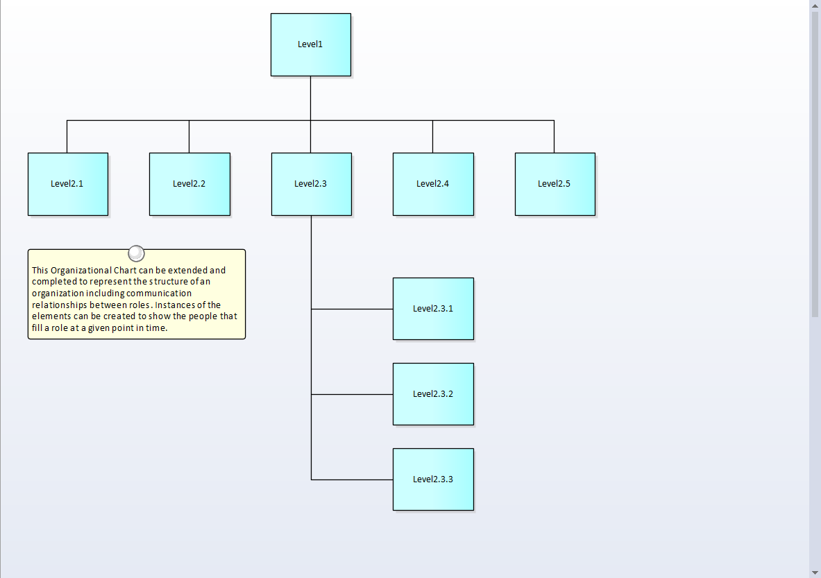 Select any element on the diagram and press Alt + Enter to access the properties. This will allow you to modify the element to reflect your own organizational structures. This basic template provides a simple starting point for creating your own Organization Chart. Refer to Tools and Techniques for step by step instructions on how to proceed.