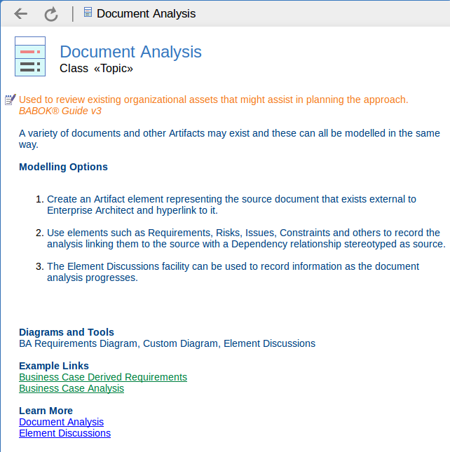 When starting with BABOK based modeling, an initial step is to reference the BABOK Guide v3 and decide on the what aspects of Enterprise Architect you are wanting to use. You can then run the Model Wizards to load these into your Enterprise Architect model ready to start you model-based analysis process.