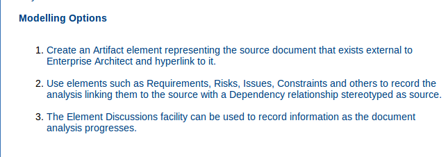Under the Modeling Options is a general explanation of the Enterprise Architect features to use. In this case it is covering importing a Document and creating relevant model elements from this. |