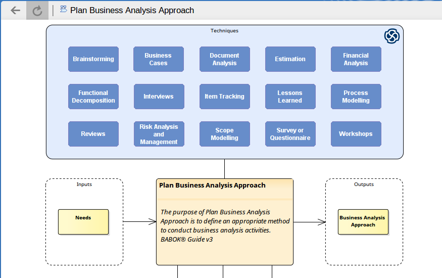 This opens the diagram covering the Techniques, in blue, used in the process: Plan Business Analysis Approach |