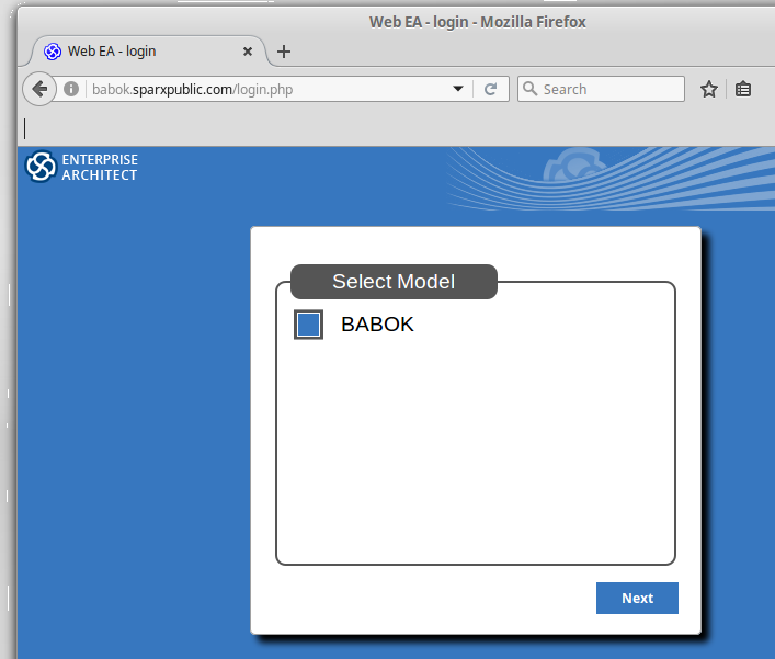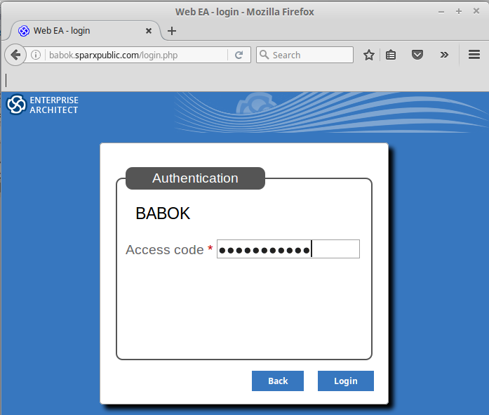 In a web browser, go to the following URL: http://babok.sparxpublic.com/login.php Select the BABOK model option. |