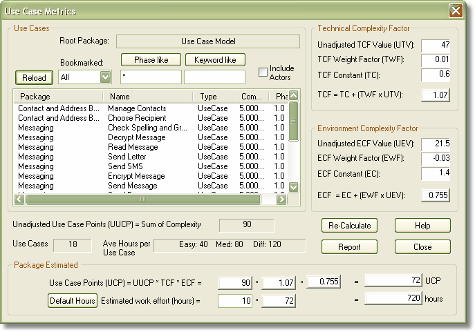 Once you have set up the use cases, actors and environment, highlight the package in the project browser whose contents you would like to estimate; for the entire project, select the root view. Next, select Project - Use Case Metrics from the menu. The following screen will appear: