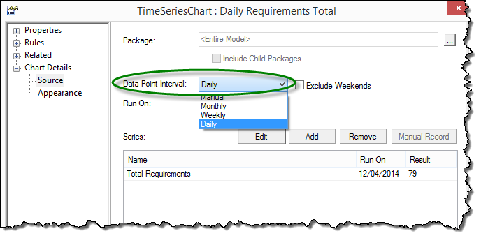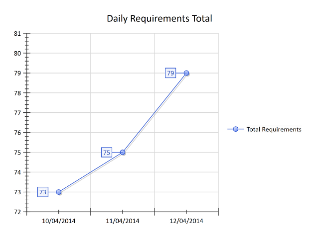 A time series chart that graphs the total number of requirement elements. The chart is generated by a Scheduled Task that is run daily.