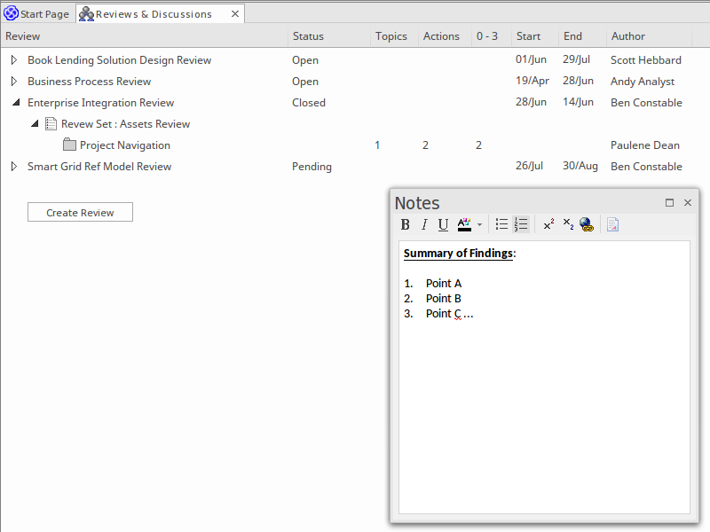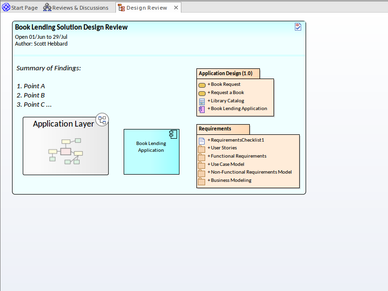 Although the example we used involved the review of a specific solution for the Book Lending system, Enterprise Architect's Review elements can be applied at any level within the model repository. The Review could be, for example, on a business process, a top-level package that represents an entire enterprise architecture view, or a third-party industry reference model.